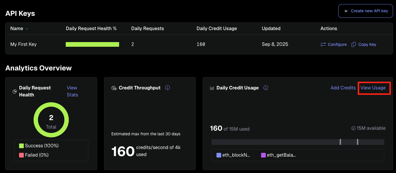 The dashboard provides an overview of your daily credit usage. Select View Usage for a wider view of your credit usage.
